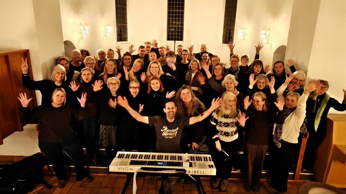Ved tangenterne sidder som altid Rasmus Grønlund, og denne eftermiddag bakkes koret op af et fuldt band (!), så der er lagt op til gospel i stort format.